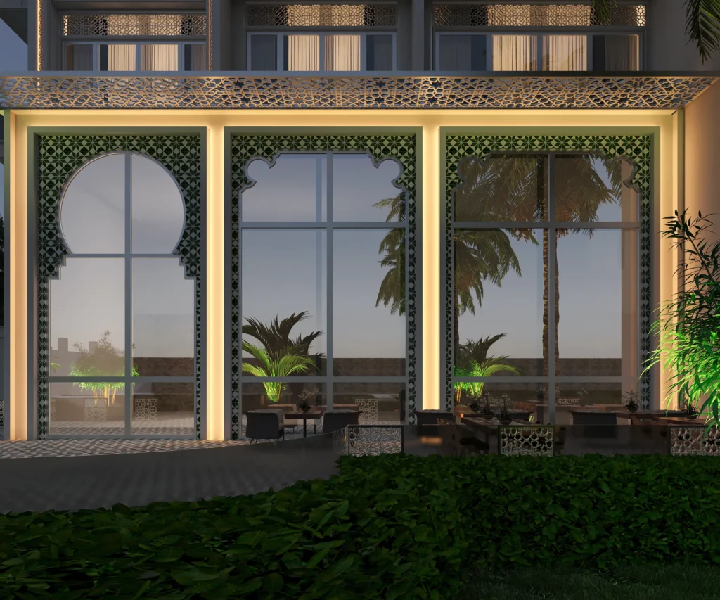 An architectural masterpiece in Saudi Arabia. Designed by Glamourous Engineering Services, this luxury hotel seamlessly blends contemporary elegance with traditional charm. Featuring a pristine white façade adorned with authentic Arabic patterns and large arched windows, the hotel stands as a beacon of sophistication