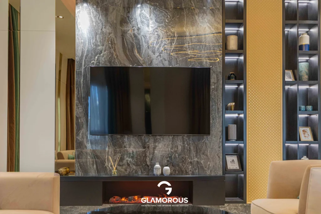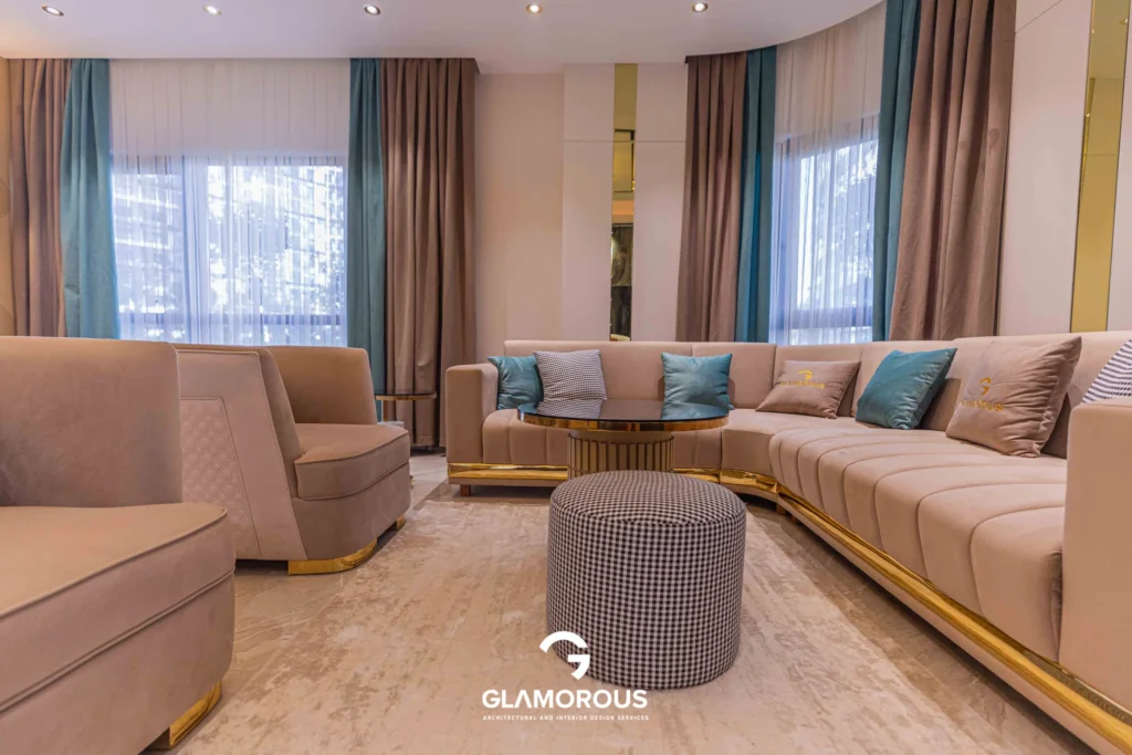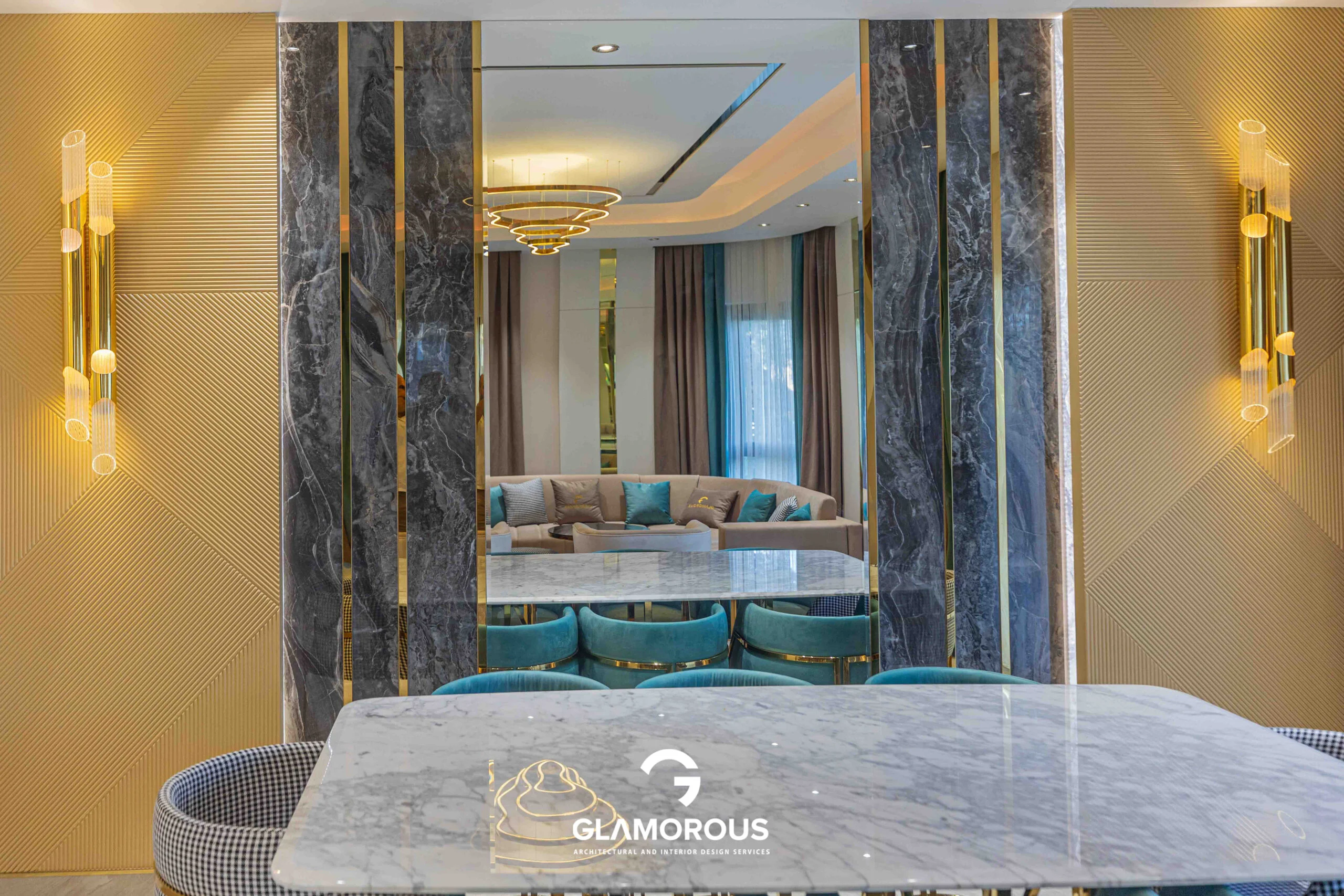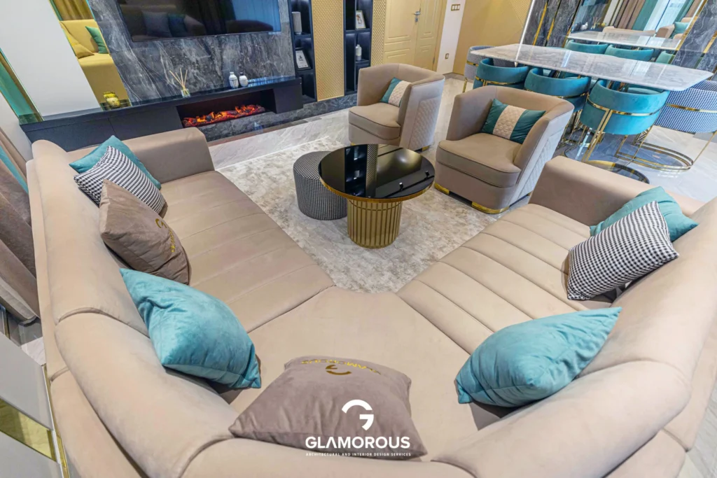 يعزز اختيار الأثاث الأجواء العامة بلوحة من اللون البيج الناعم والأزرق المخضر الغني، مما يوفر مزيجًا متناغمًا من الراحة والأناقة. ولرفع مستوى التصميم، تم دمج لمسات خفية من الشرائط الذهبية ، مما يضيف لمسة من الفخامة والرقي في جميع أنحاء الشقة. تم اختيار كل عنصر بعناية لإنشاء مساحة تنضح بالأناقة والفخامة والحياة العصرية.