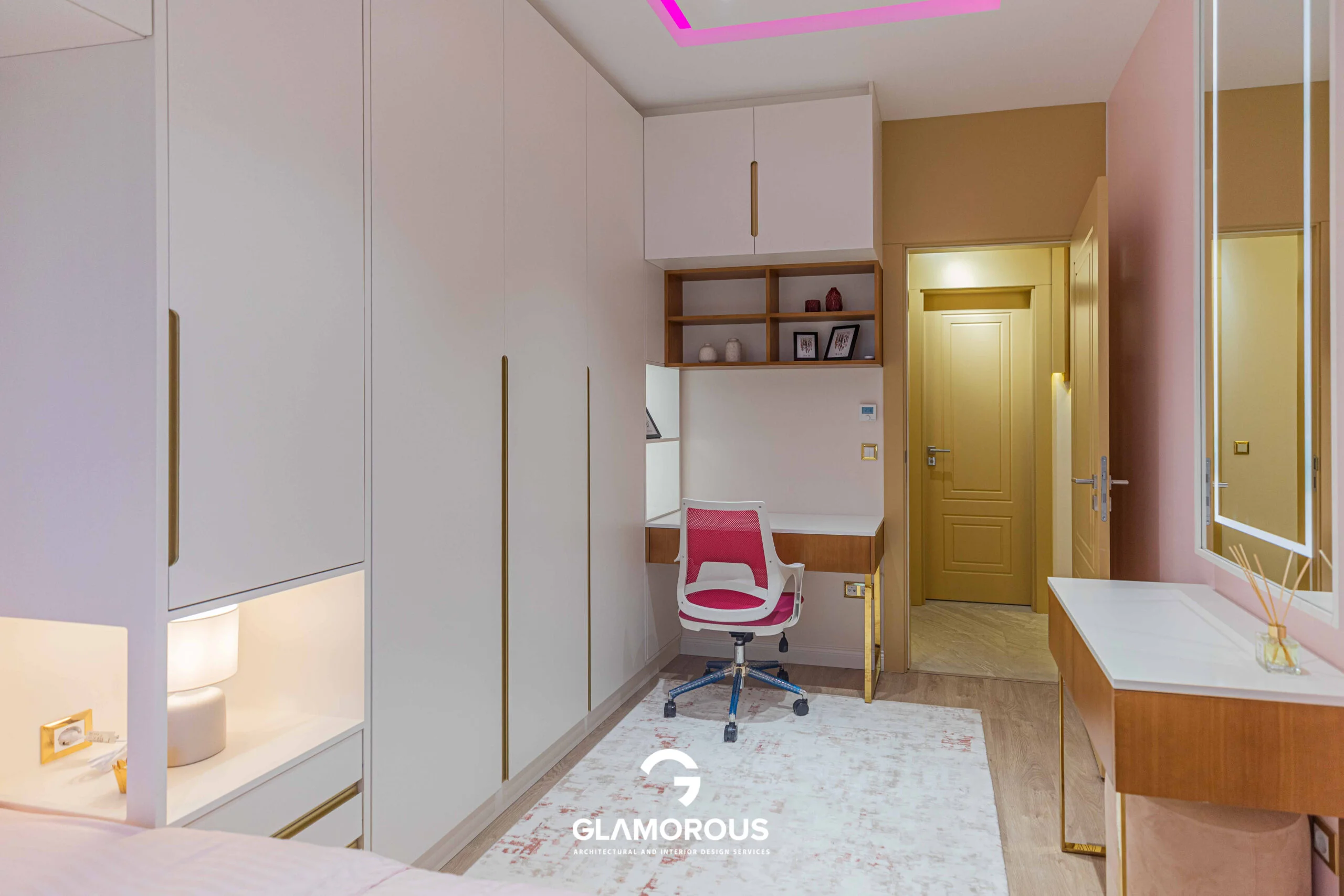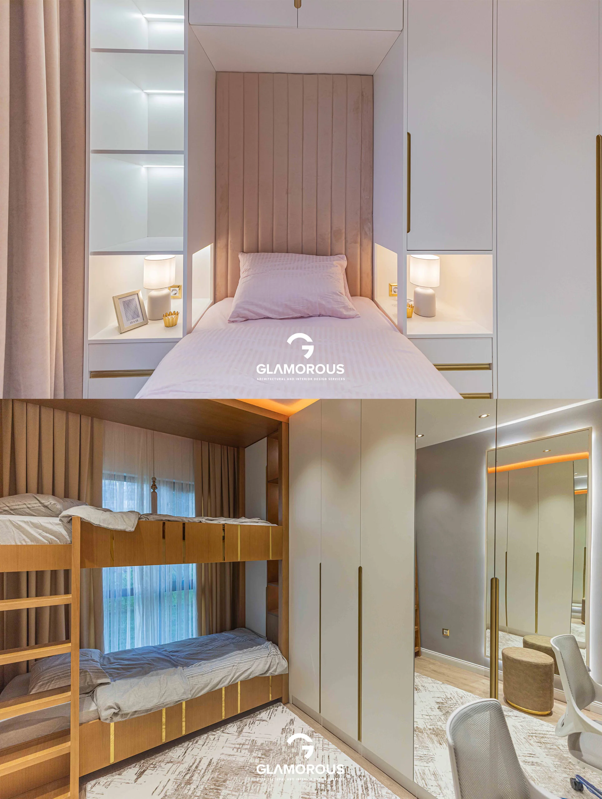استجابة لطلب عميلنا بغرفة أطفال صغيرة وكاملة الوظائف، استخدمنا استراتيجيات مبتكرة لتوفير المساحة لتحقيق أقصى استفادة من كل سنتيمتر. وعلى الرغم من المساحة المحدودة، نجحنا في دمج جميع العناصر المرغوبة، بما في ذلك منطقة نوم مزدوجة مريحة ومكتب للدراسة ومساحة تخزين واسعة.